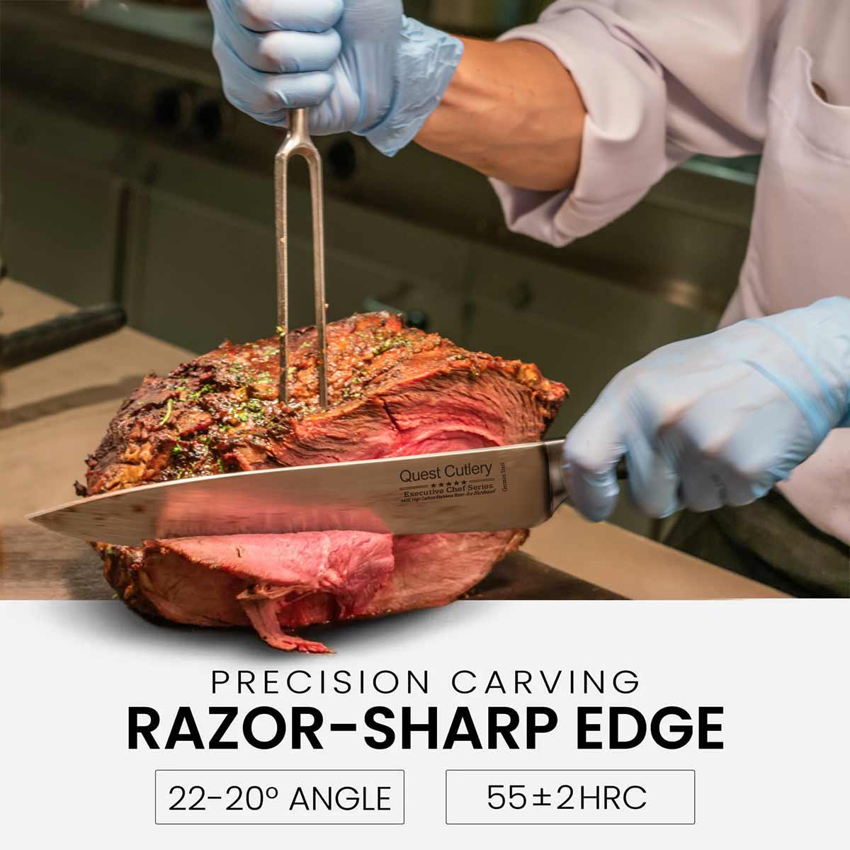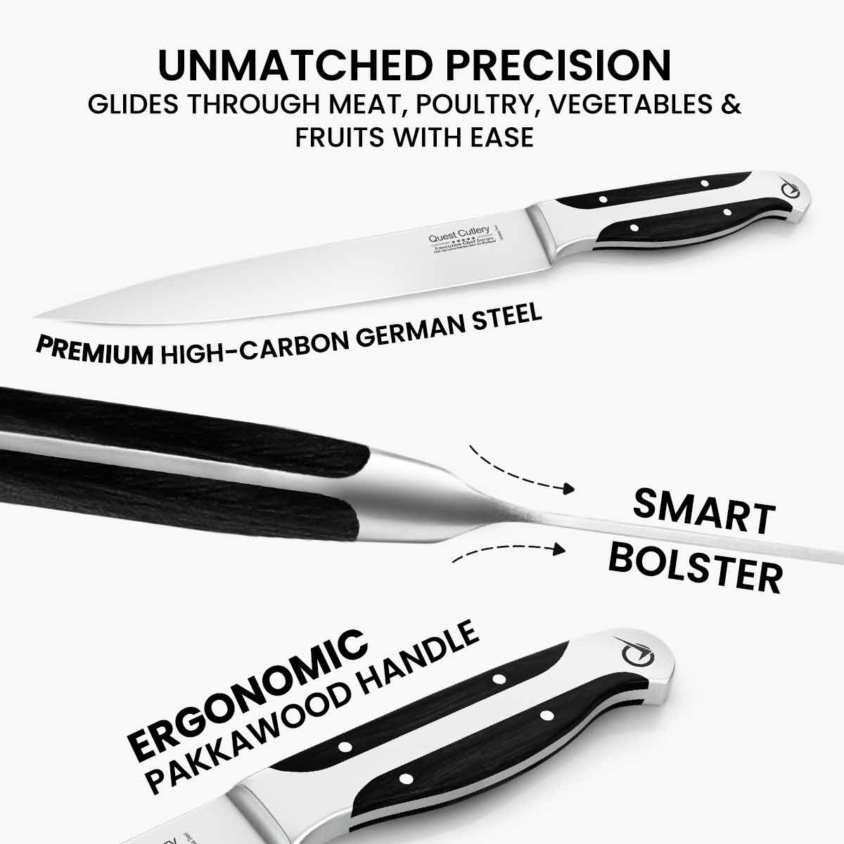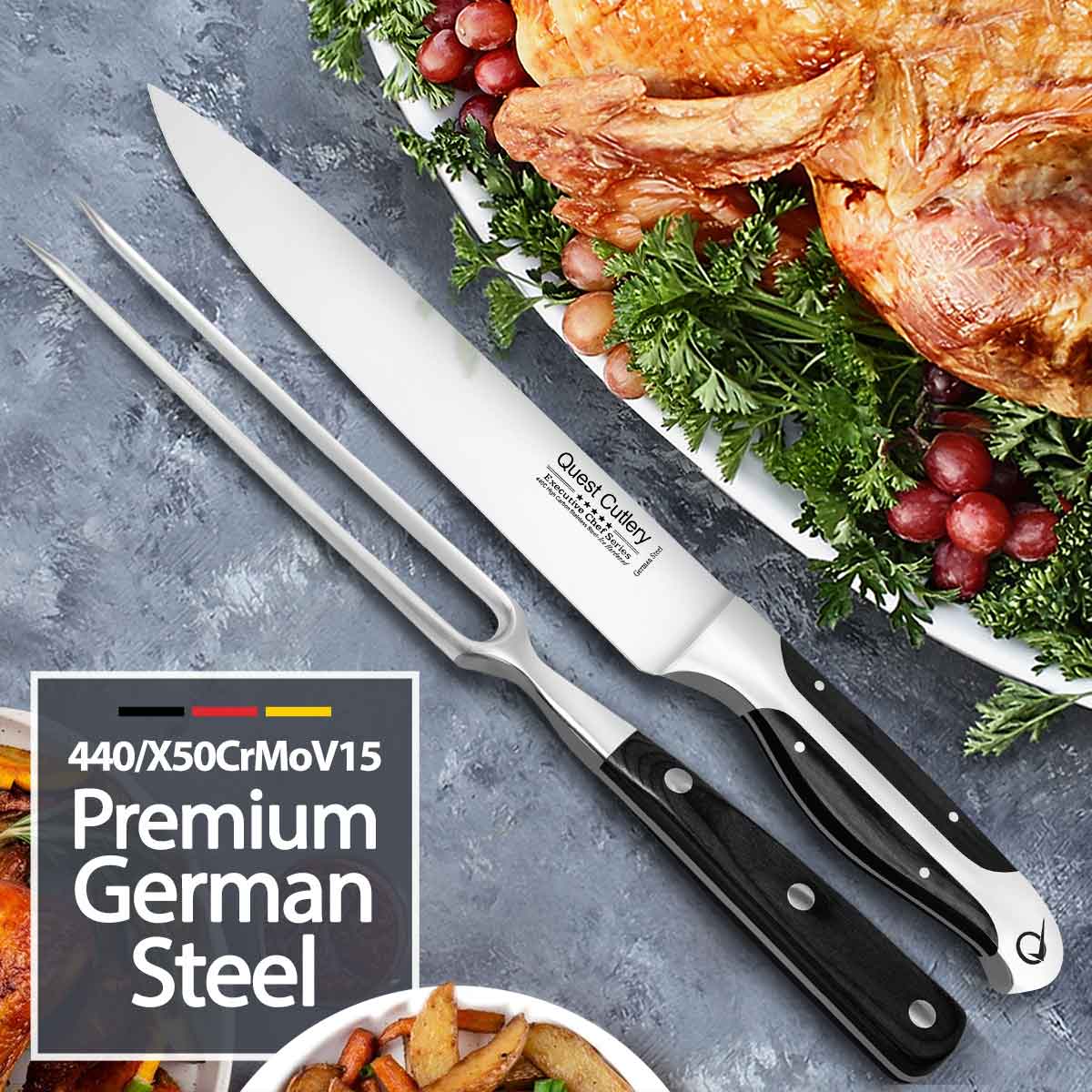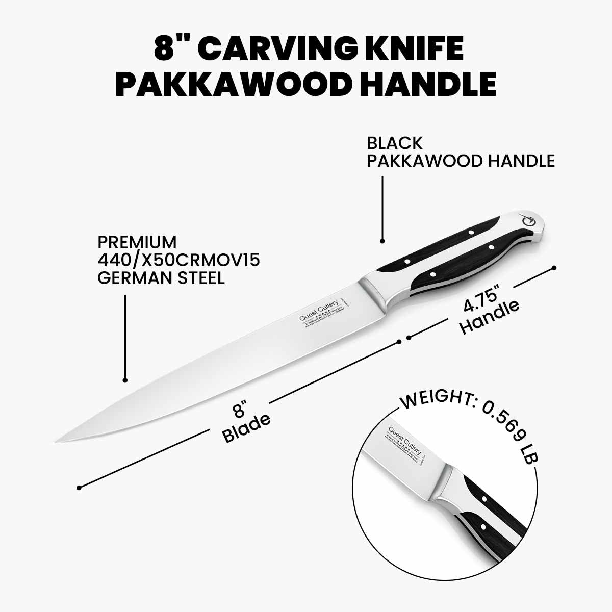 Elevate your carving experience with the Quest Cutlery 8" Carving Knife Set. Meticulously crafted from premium high-carbon steel, this set offers unparalleled precision and durability. The ergonomic Dark Pakkawood handles and innovative Smart Bolster™ ensure superior balance and control, making it ideal for slicing beef, poultry, or pork with ease. Accompanied by a carving fork featuring long, thin prongs for precise carving of poultry, roasts, and turkeys, this set is perfect for family dinners, BBQs, and holiday celebrations. Upgrade your culinary arsenal with this exceptional set, designed to meet all your carving needs with style and efficiency.
