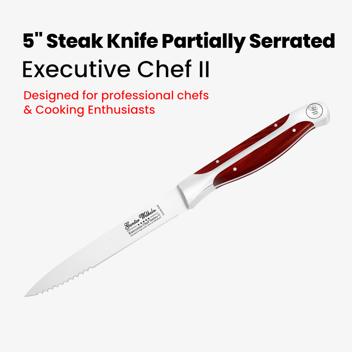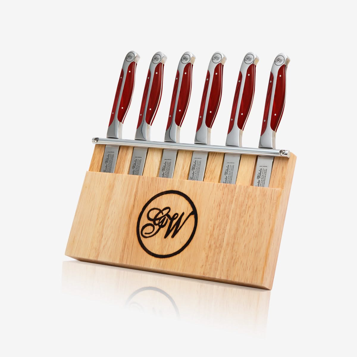 Efficient and affordable, the Refurbished 7-Piece Steak Knife Set with Extended Wood Block features six 5-inch partially serrated steak knives presented in an attractive wood block. Crafted with our patented Full Triple Tang design and finished with injected reddish ABS handles secured by four decorative rivets, these knives offer exceptional durability and stability. Ideal for slicing through steaks and chops with precision, they are precision forged from high‑carbon German steel for long‑lasting sharpness. This set adds efficiency and elegance to your kitchen and dining room.